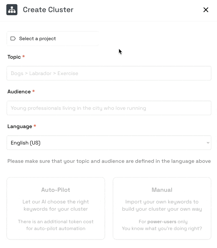 Think of projects as folders for your content, making it easy for you to manage and organise related content and campaigns. You can create as many projects as you like, and clusters can be moved between projects very easily. If you feel like it you could even categorise your existing clusters into projects.