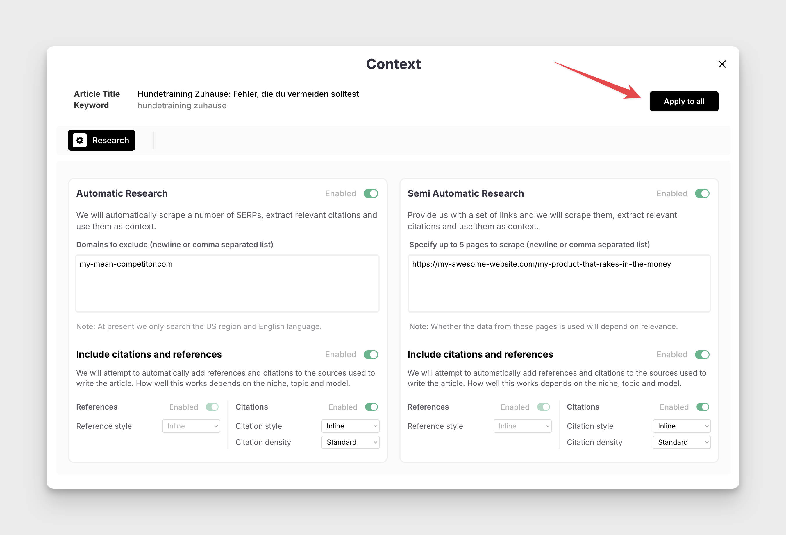 When changing Research settings for an article, there's now a handy little button that will apply all the same settings to all other unwritten articles in the cluster. Boom!