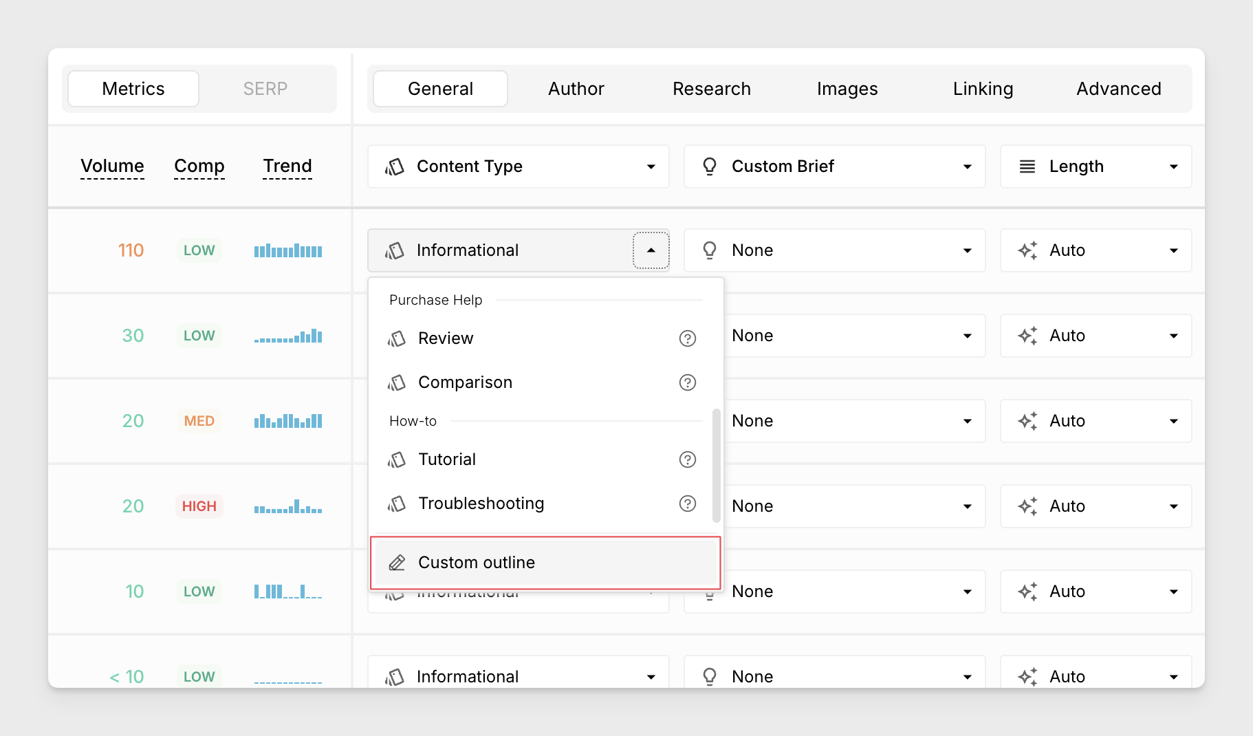 To create a custom outline for an article, open the Content Type menu and choose "Custom outline" from the bottom of the menu.