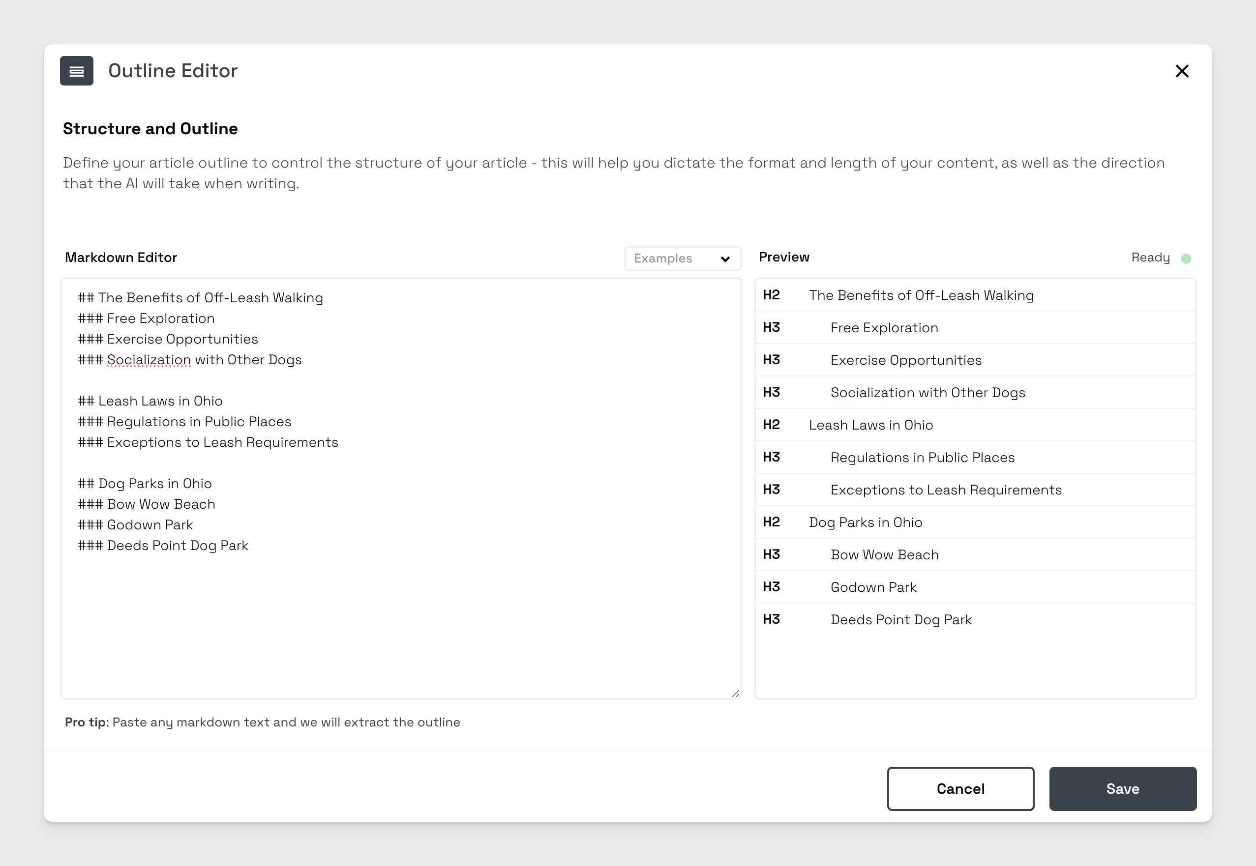 Providing a custom outline allows you to create content to a predefined structure, this is extremely useful if you have a specific outline in mind.