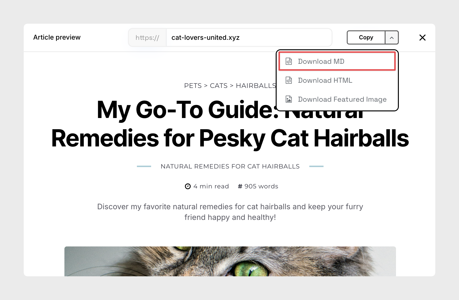 Markdown can be useful if your CMS uses markdown or if you prefer to edit raw markdown files (good for you!). Many modern CMS and blogging platforms allow you to add blog posts are basic markdown files. We don't currently provide frontmatter or mdx, but you can easily export your articles as basic markdown files.