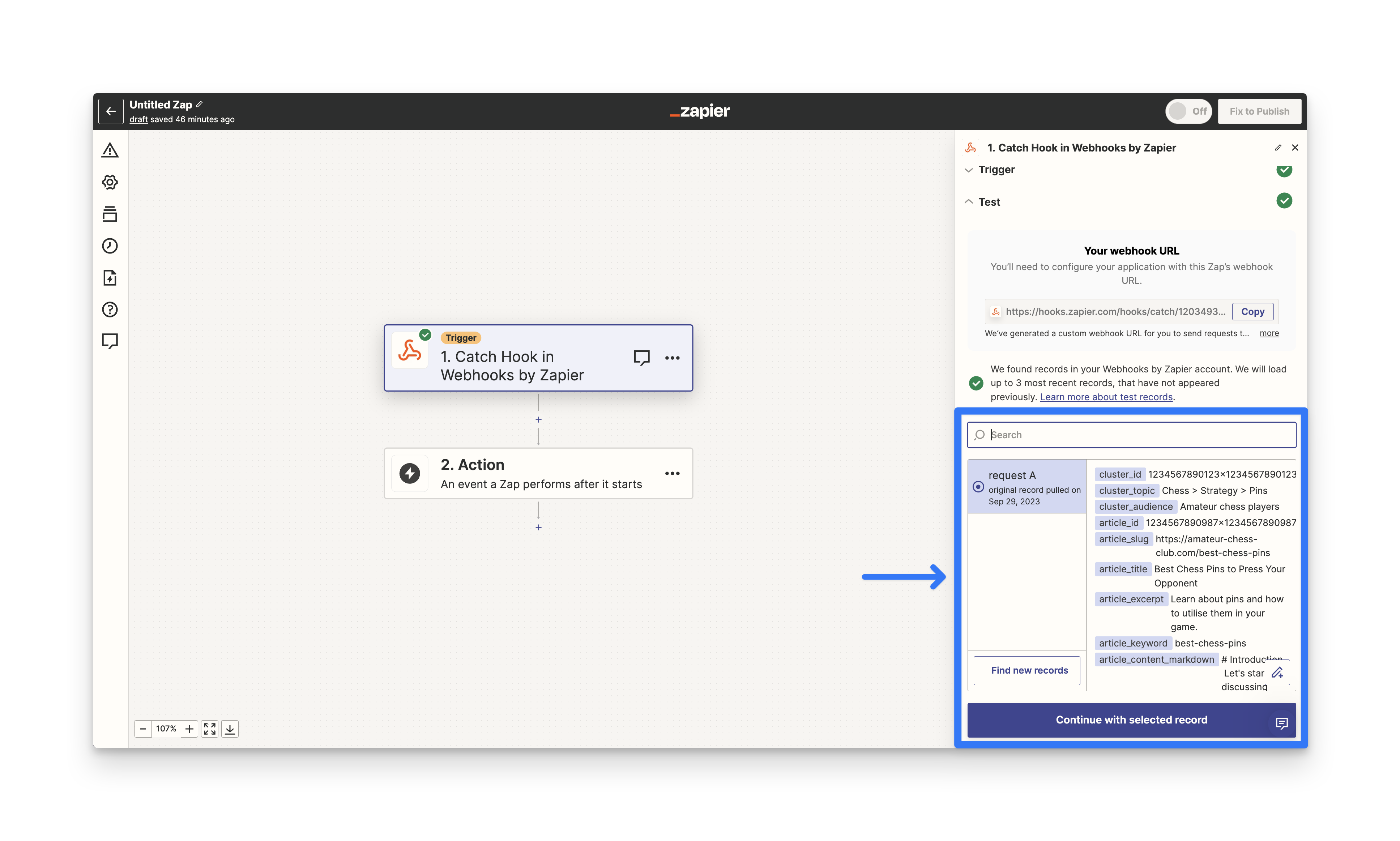 - Type a name that makes sense for your action (eg "Post to Webflow").
