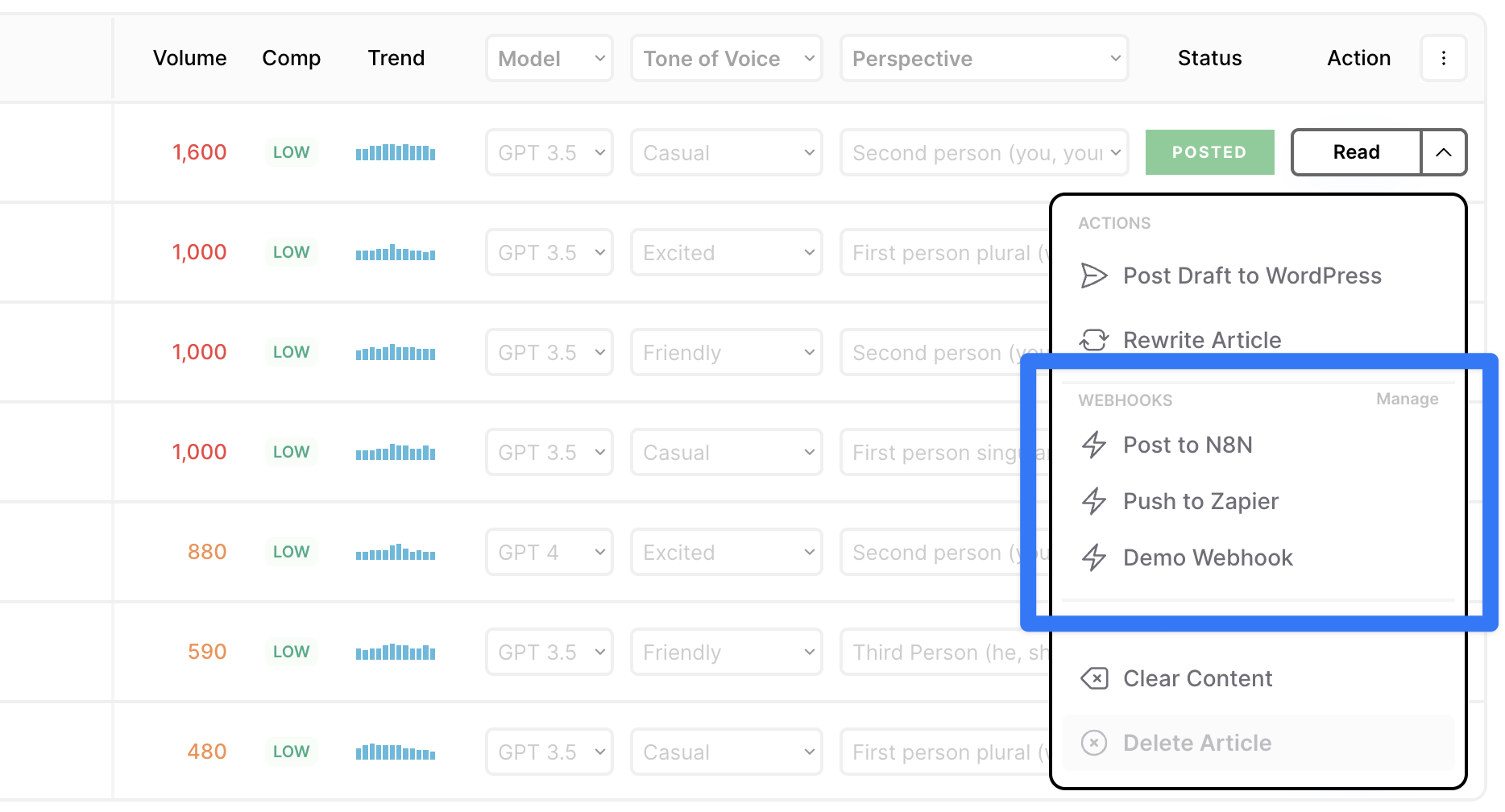 Enabled Webhooks will show up in the article and cluster context menus - simply click the one you want to execute.